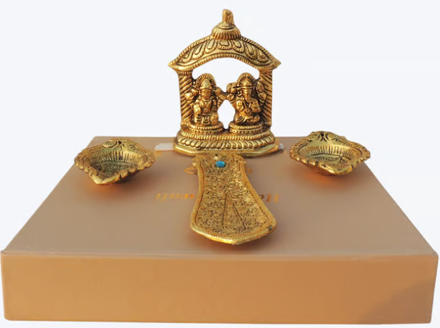 Aluminium Diwali Pooja Set With Agarbatti Stand, Deepak & Laxmi Ganesh Pair Statue (AC428)