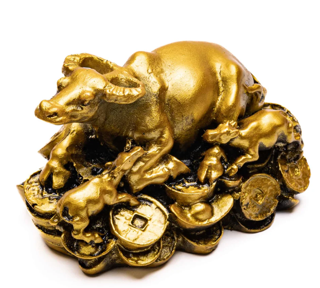The calves near the cow symbolically signify good descendants' luck. This makes good gifts for childless couples whose wish is to have children. In places like India and Nepal, the cow is considered an extremely holy animal. The cow is treated as a sacred animal because it provides much sustenance to humans. In Chinese culture, it represents a good harvest, rewards for hard work, and perseverance. Turning the first page of the Chinese Almanac (Tung Shu), one will see the picture of the cow. In many oriental cultures, the cow is regarded as a symbol of good tidings. The cow is also believed to possess the power to realize your wishes provided that the person treats it with the utmost kindness. The symbolic cow depicted pulling a bag of gold or seated on a pile of gold ingots is believed to be a very potent Feng Shui relic. Wish cow is helpful for deals in the share market and business. Wish cow is useful for home or office to attract fortunes, prosperity, and wealth and to maintain the desired growth. Place this wish cow on the desk of your office or table in your house to wish fulfillment. It helps to bring prosperity and happiness to your life. It brings success in business encounters, luck in investments, and luck in stock speculation. Place wish cow on the study table to enhance memorizing capability and to achieve better marks.